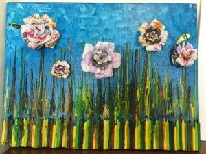 Inspired by the ephemeral artwork that has been a classroom focus, this multi-media scene was melted onto canvas, then adorned with bees and paper flowers. The paper flowers are sculpted out the amazing patterns that emerged from the children’s drip paintings. The colorful and outstandingly unique “Gocce di Cera” is a bright and happy work of art and embodies the spirit of the children artists of the pre-k class!